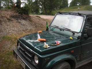 Schwarm Fliegen mit lautem Gesummse empfangen. Also nichts wie ins Auto