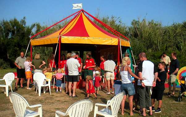 um das Zirkuszelt finden wir einige Spielgeräte vor, die Animateure